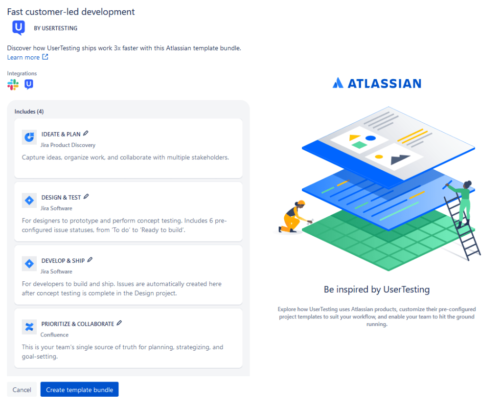 So, the first template is from UserTesting, which helps companies test their products with real-live people. Their template includes 3 Jira Projects (one JPD and two JSW) and a Confluence space. The overall theme of the template is to take an idea from customer requirement to shipped feature while keeping that customer top of mind.