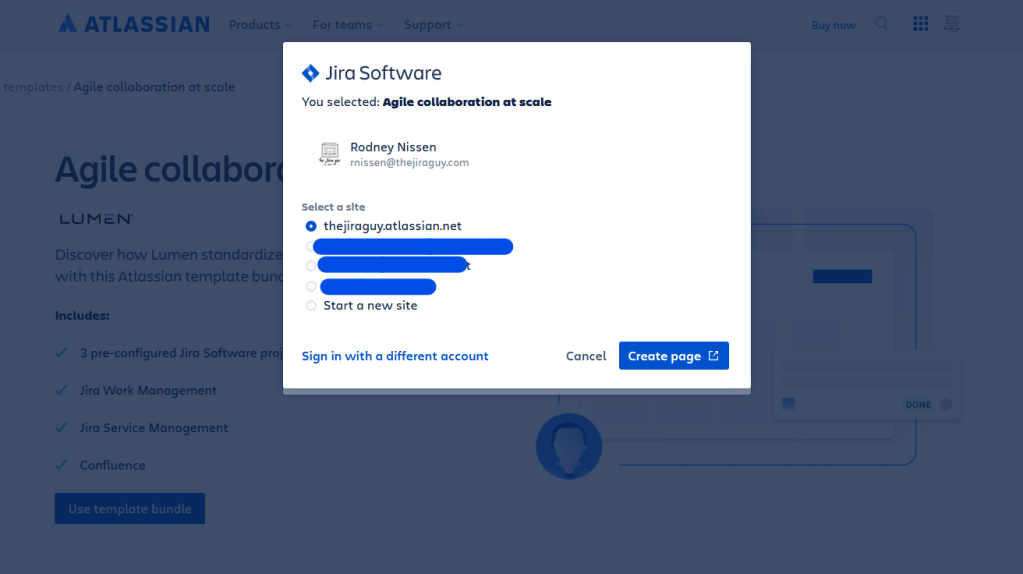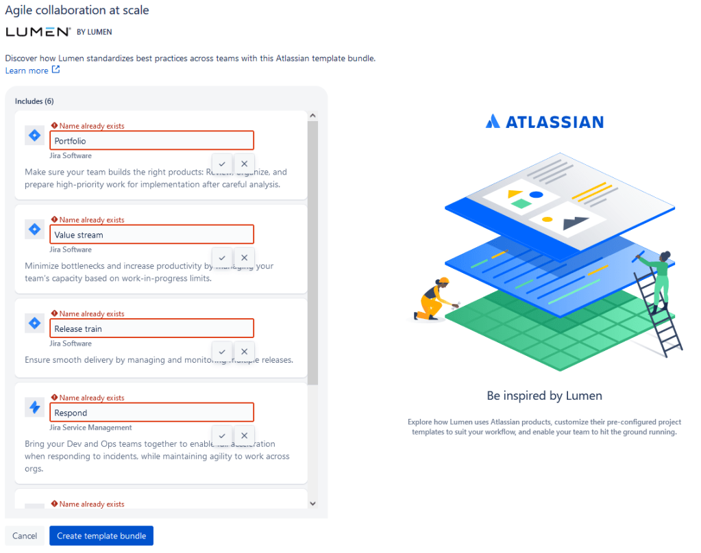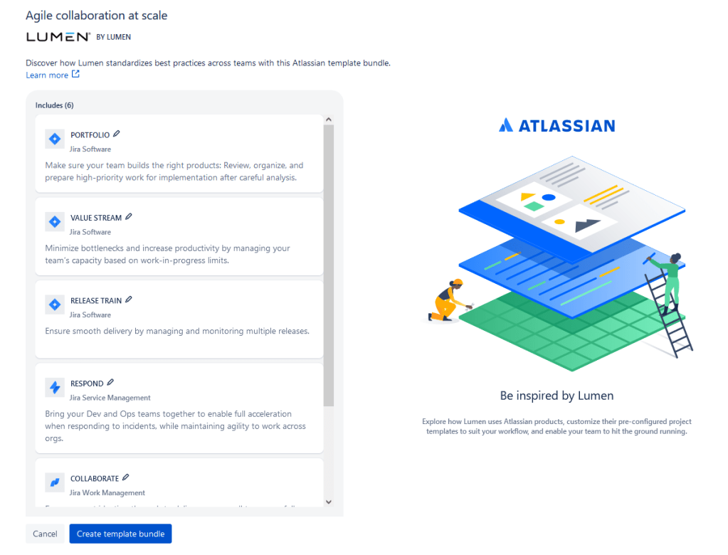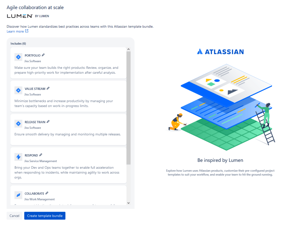 The last customer template (as of the time of this writing) is from Lumen, who looks like they are a Cloud provider. Their template concept is, “Agile at Scale,” and it looks like their template is one of the most involved to date with five Jira projects (3 JSW, 1 JSM, and 1 JWM) as well as a Confluence space.