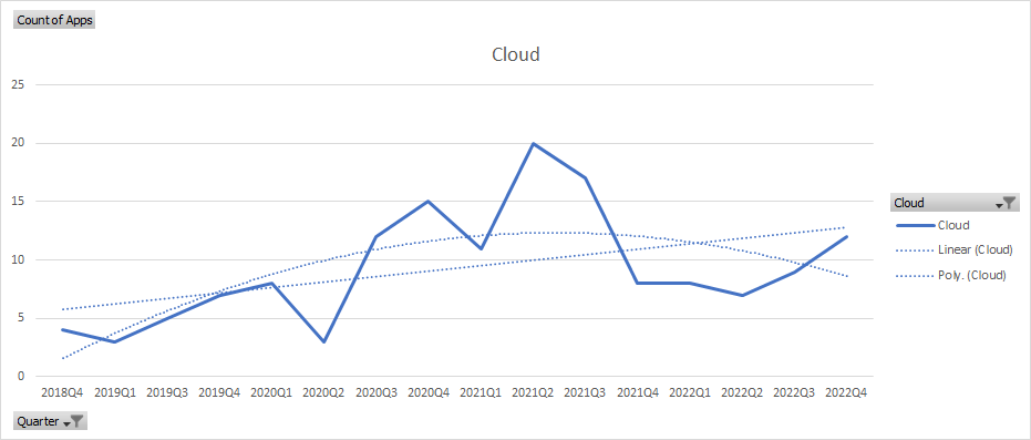 So, for Cloud Apps, things are trending up. My first hunch would be to say that this does confirm our hypothesis until I remember that the entire category is growing in the Marketplace. Every month, more and more vendors are figuring out how to make their classic Data Center and Server Apps available on Cloud. Some of these may debut as free while tested, then move to free once confirmed functional. Honestly, we don’t have enough data to say conclusively. If you look at the Polynomial trend line, it’s starting to curve downwards, meaning while it may have been rising during the overall period, it might be trending downwards now.