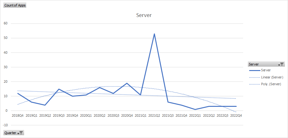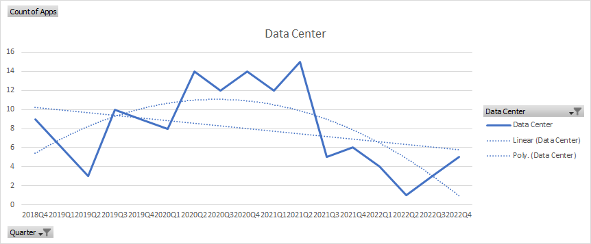 This one is clear-cut. Under the polynomial analysis, the trend started positive but has sloped downwards since. Even the linear analysis shows a negative trend overall. Now, there was elevated activity here immediately after the Server announcement and lasting through 2021Q2. But now, companies are betting that Data Center will be here to stay for the foreseeable future, and are willing to do business in that space.