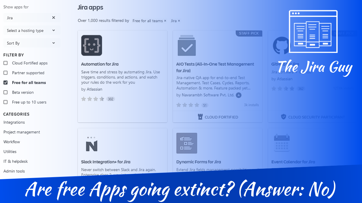So, the reader’s position is that they feel Free Apps in the marketplace will eventually become a thing of the past. This situation would be easy to imagine, as these Free Apps have always been a rarity within the Atlassian Marketplace. And, to be frank, most of them are for Atlassian’s Server products, which as of this writing, only have about 11 months of life left.