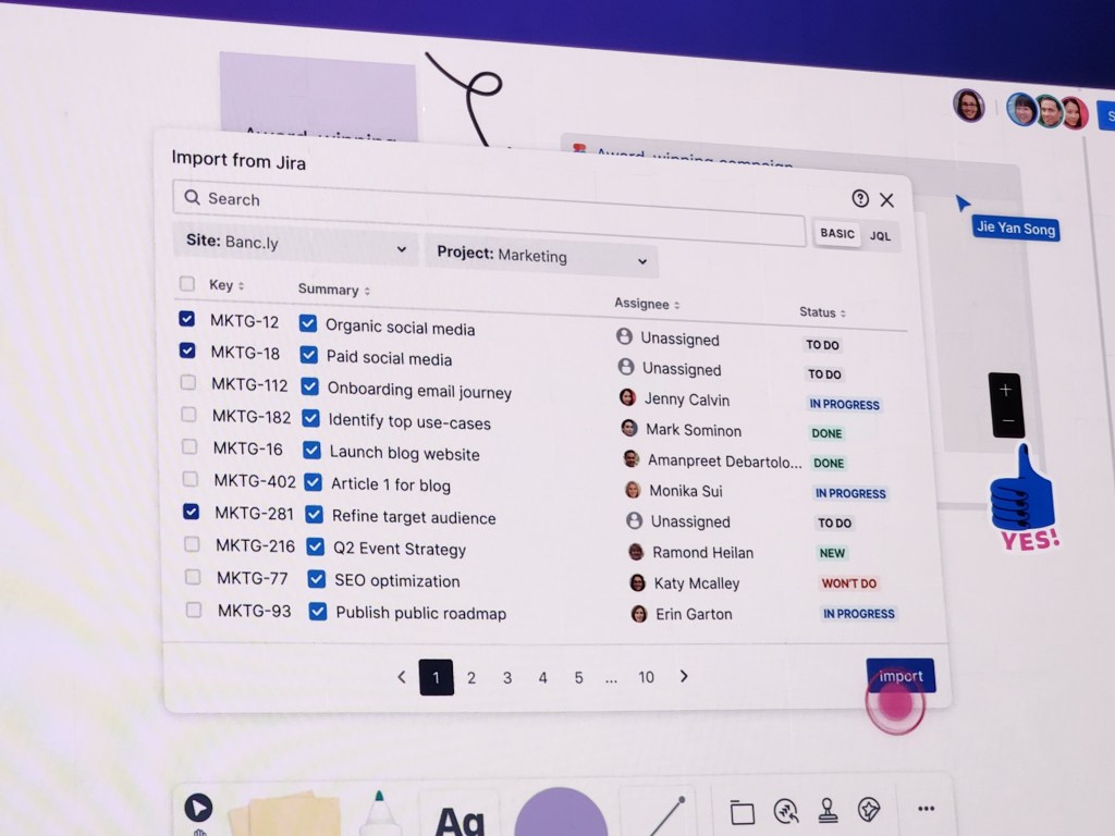 Because Confluence (and therefore it’s whiteboard) is so deeply integrated into Jira, you can also directly import your Jira tasks into the board to have them reflect the status of the underlying Jira issue in real time.