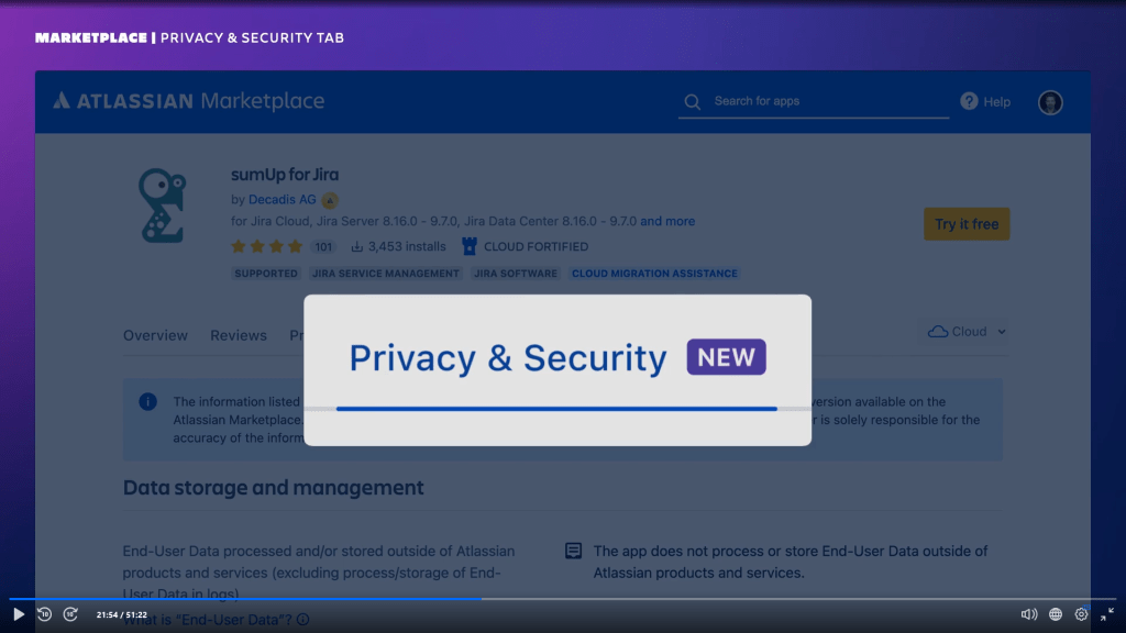 Atlassian states, “This new tab will provide important details about cloud app security and privacy all in one place, helping customers with security and compliance requirements assess apps during the procurement process.”