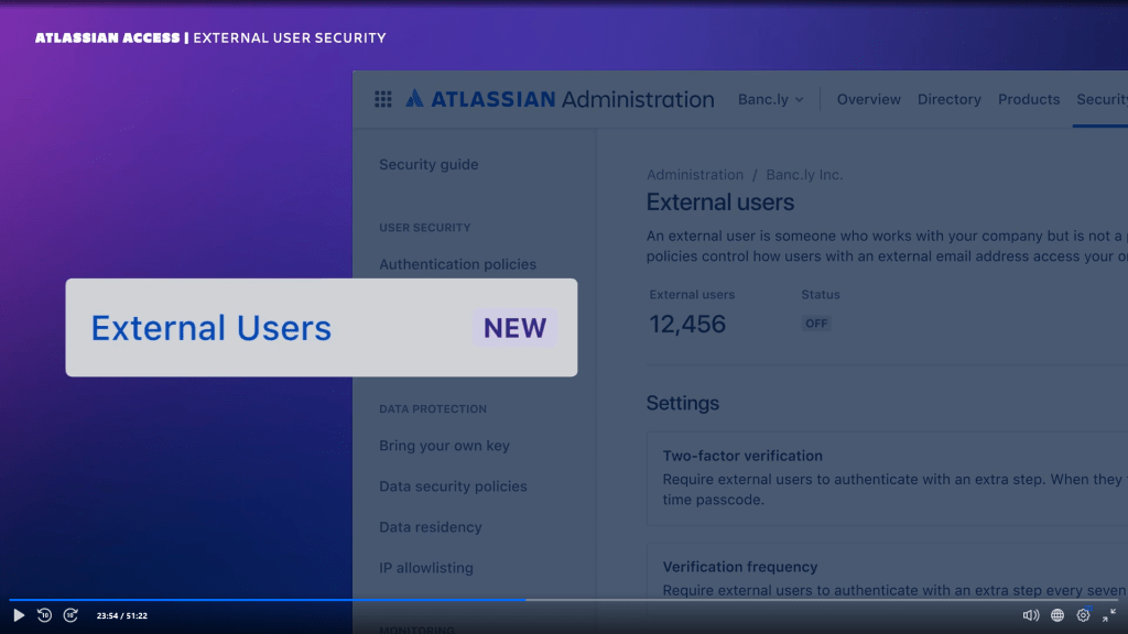 Soon, you can grant external users access to your Atlassian Cloud instances. You can also enforce that these users outside your organization must comply with two-factor verification and set how often they must verify.