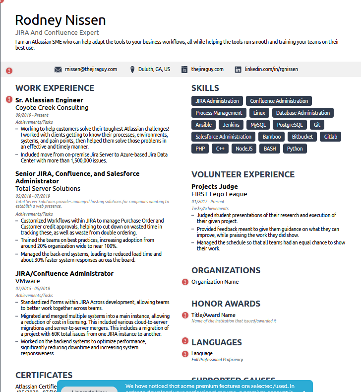 Numbers. Numbers everywhere. No, from what I’ve been told, you should include numbers as often as possible and have them tell a story. Did you move a Jira instance? How many users did it support? How many issues did it have? Did you drive adoption? What percentage of the company was using it, and what percentage when you finished the drive? Improve uptime? What was the final uptime percentage? Have the number tell your potential employers how you made life better for your users.