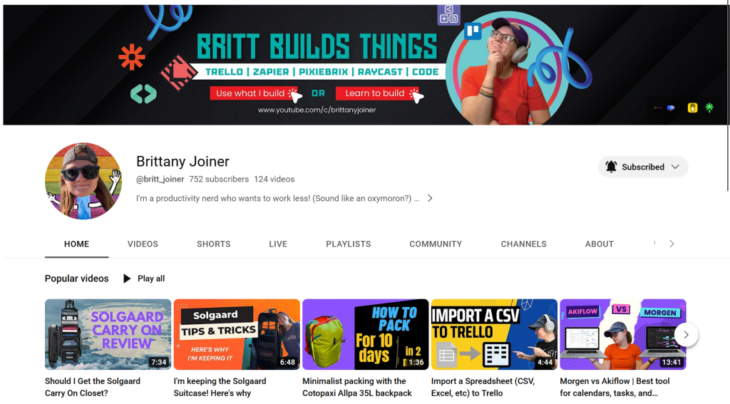 Brittany is one of those people that I dare you to be depressed around. She just exudes such energy and happiness that it’s always a fun time whenever she jumps onto a call or you run into her in person. I actually got to meet her (as well as Jimmy and so many others) for the first time in person at Team ’23, but we’ve talked online and worked together so much that it very much didn’t feel like that. As for her content, whether she is doing ridiculous live streams or just normal videos, she is the goto source for Trello and PixieBrix content.