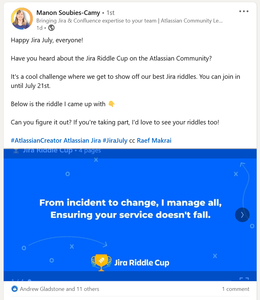 Manon is another creator whose content I’d have likely missed if not for the Atlassian Creator program. She is mostly making content for LinkedIn, but is also known for her monthly French newsletter for her company – that she might be expanding to English.