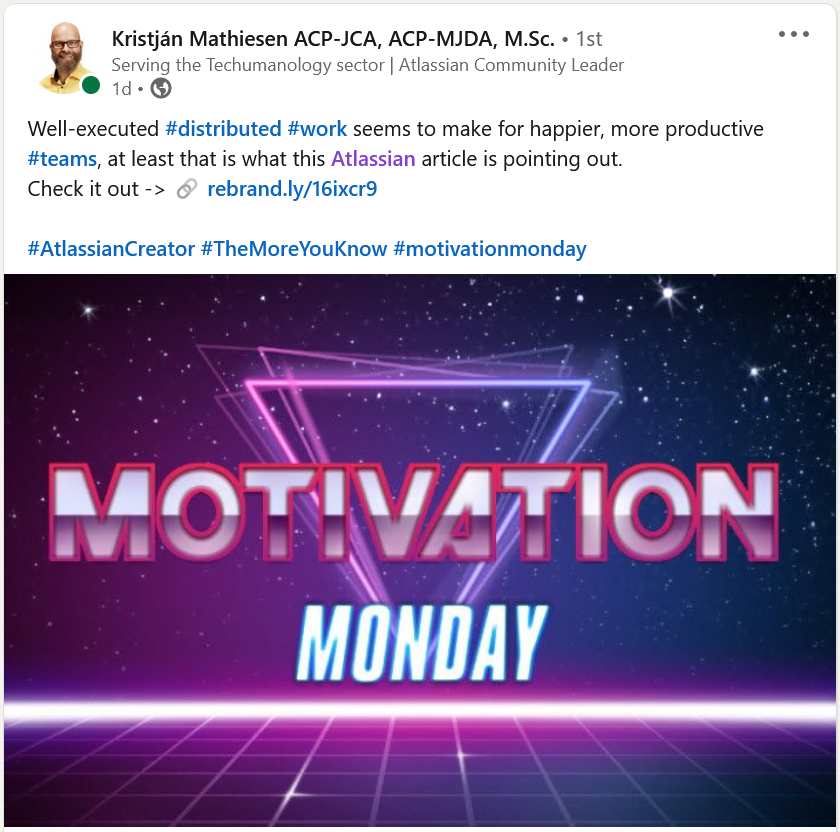 Kristján is one creator I’ve started following myself as a result of the Atlassian Creator program. His content usually has a wonderful vaporware theming to it, making it recognizable whether he’s posting his normal content on LinkedIn or continuing his countdown to Team ’24 on the Community Leader Slack workspace. As I stated, Kristján was a creator I discovered through the Atlassian Creator Program and is one I personally follow.