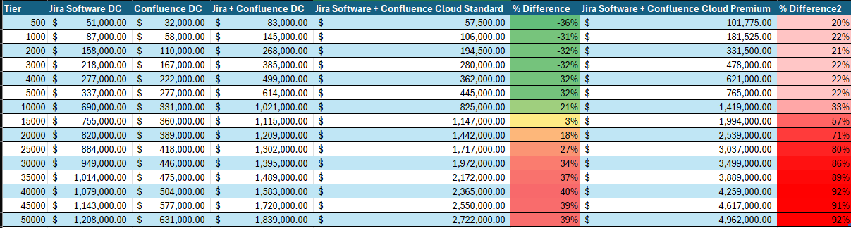 But sure, let’s look at the numbers. During the Server EOL announcement, I pointed out that people in specific circumstances will save money by moving to DC or Cloud. Well, I ran the numbers again. I should be clear, to get the closest parallels to functionality on DC, you will want Cloud Premium – but I threw in Cloud Standard into the mix to see how it compares price wise. All measurements were based on an instance of Confluence and Jira Software, at the various tiers