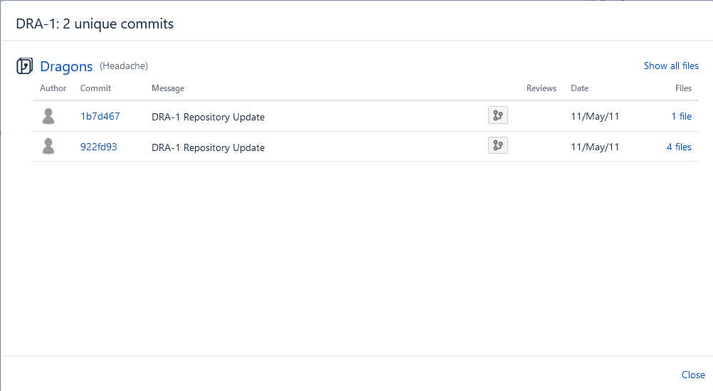 - In FishEye, you can see the related JIRA issue key. In the Repositories drop-down menu choose the Dragons repository, then click the issue key (DRA-1) to view the issue details in JIRA.